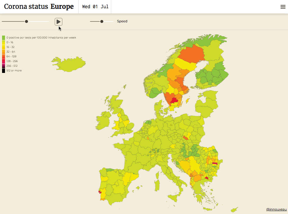 De verandering-modus is heel nuttig om te zien of en wanneer een lockdown (of andere heftige maatregelen) aanslaat. Bovenstaand Europa half november, waarin de landsgrenzen duidelijk zichtbaar worden, doordat het ene land al eerder een lockdown heeft ingesteld dan het andere land.